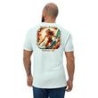 On the back of the shirt on the sides, it says - Ke aloha no ke kai nui which means “Deep love for the great ocean.”